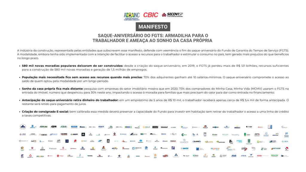 Para aprofundar-se neste tema e entender melhor as implicações dessa discussão, acesse o artigo original [aqui](https://cbic.org.br/manifesto-setor-da-construcao-alerta-para-os-riscos-do-saque-aniversario-do-fgts-e-defende-preservacao-do-fundo-para-moradia-popular/).